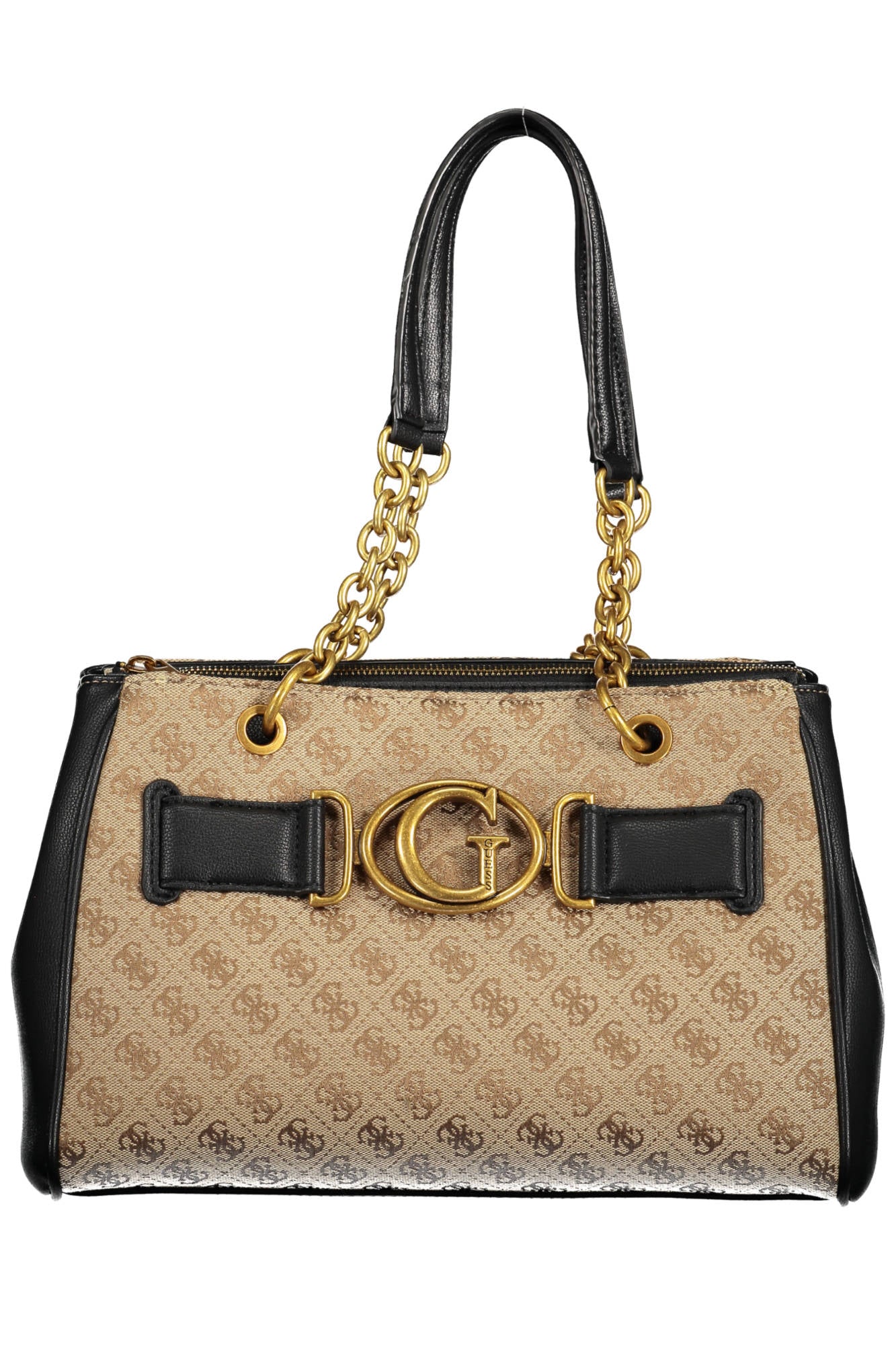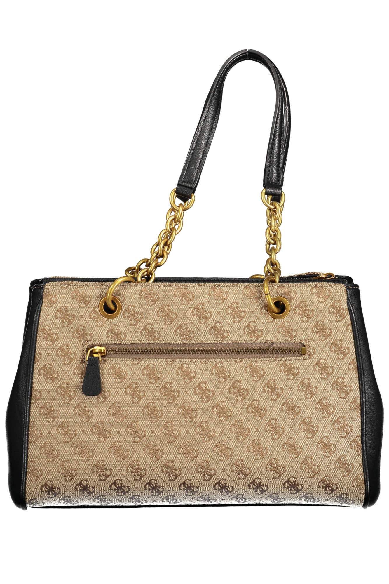 Bag with 2 chain handles, 1 external pocket, 3 compartments, 1 central pocket, 1 internal pocket, internal phone holder spaces, contrasting details, zip and snap closure, logo
