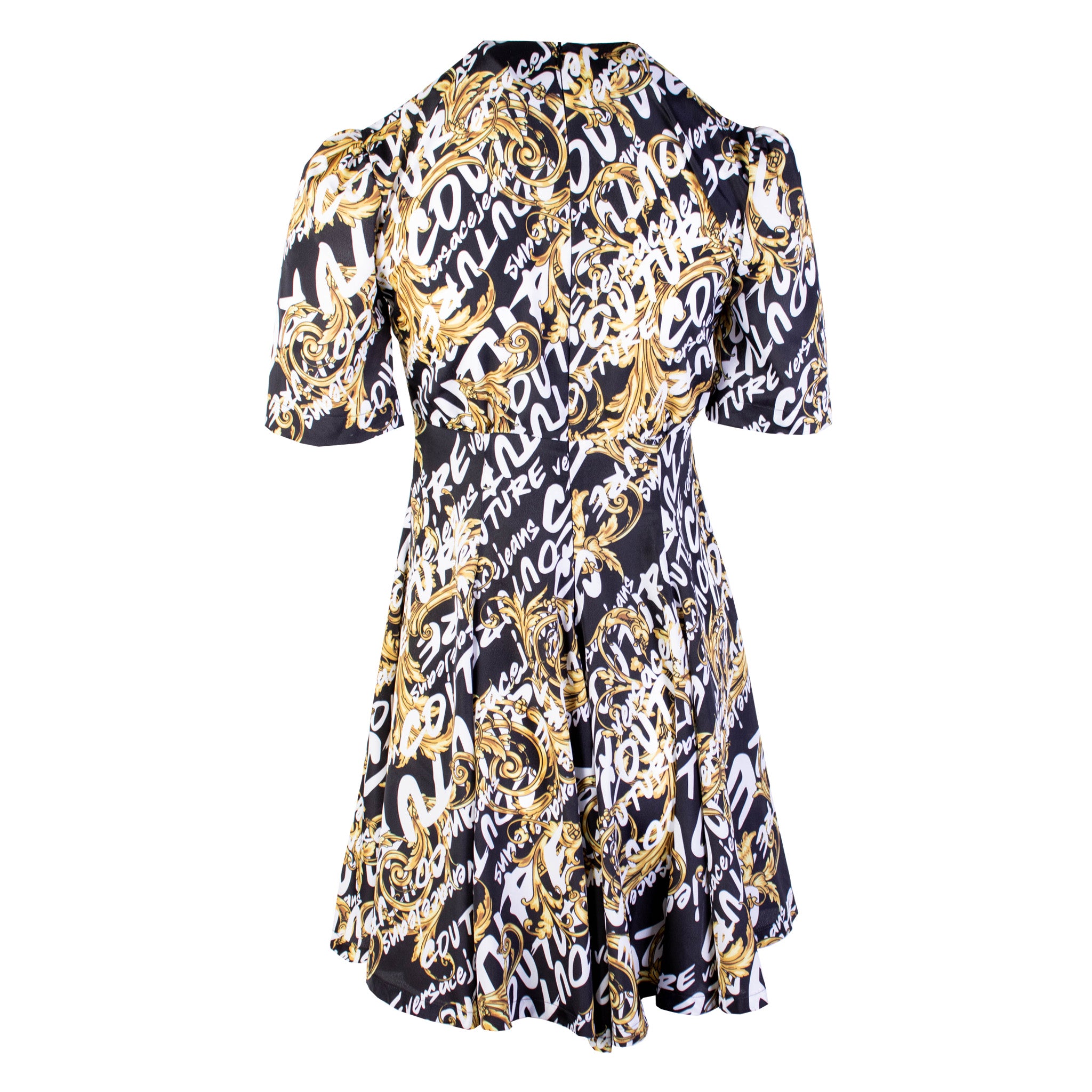 Model:  Mid-lenght Versace Jeans Couture baroque printed dress with covered zip closure on the back, short sleeves, round neck, flared