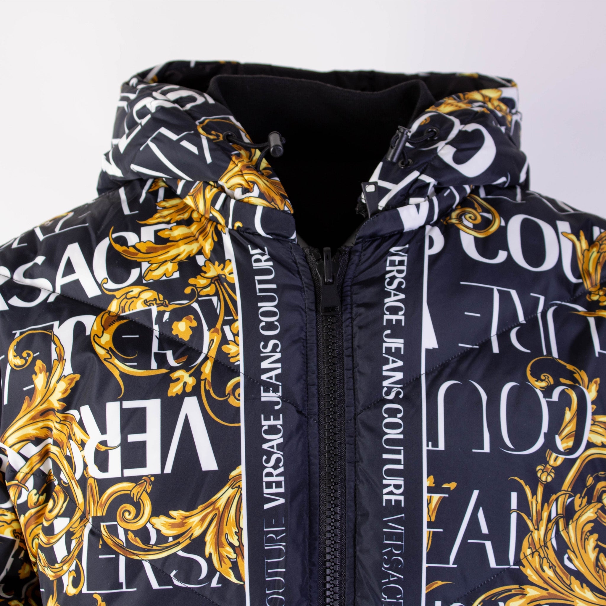 Model:  Quilted jacket for men with Baroque printed all over, reversible jacket, two side pockets, detachable hood. B Side. Black with white logo on the back